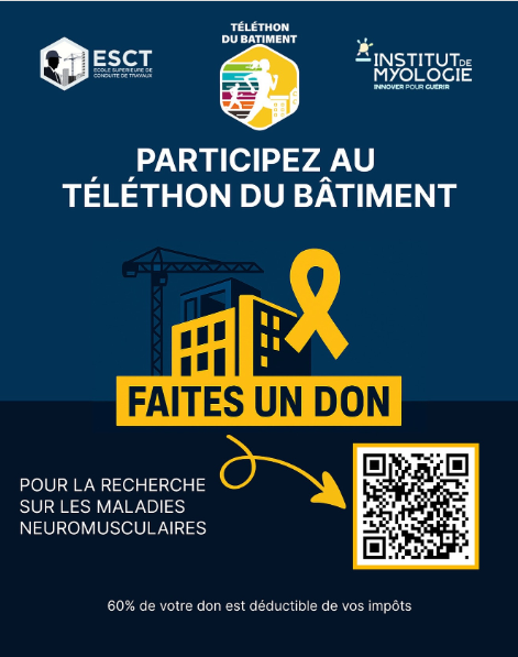 L’École Supérieure de Conduite de Travaux (ESCT) est la première école à rejoindre le Téléthon du bâtiment. Organisé pour la seconde année consécutive par Synerciel, cet évènement rassemble constructeurs, industriels, distributeurs et réseaux du BTP au profit de l’AFM-Téléthon et de l’Institut de Myologie.